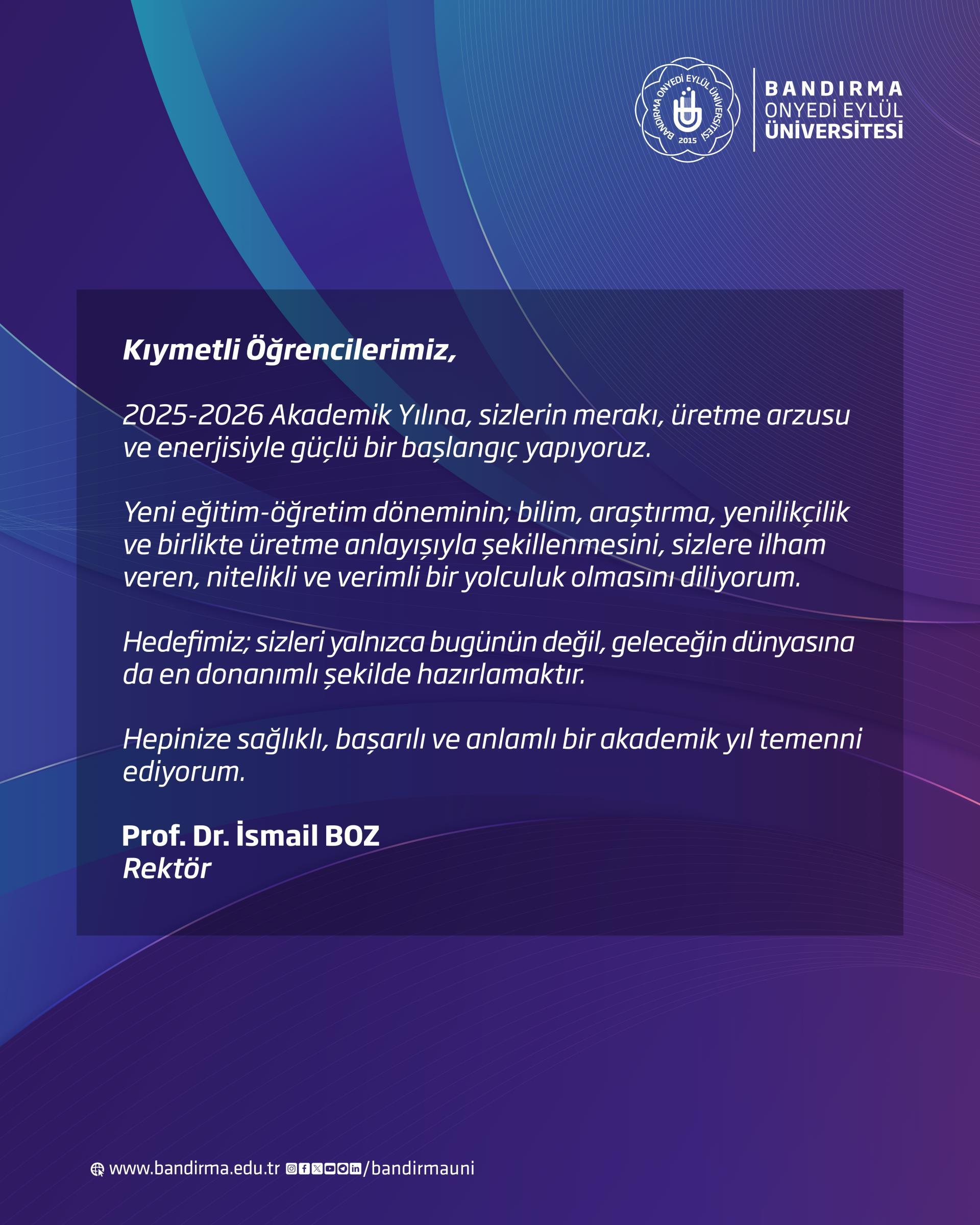 - Rektörümüz Prof. Dr. İsmail Boz’dan Öğrencilerimize 2025-2026 Akademik Yılı Mesajı