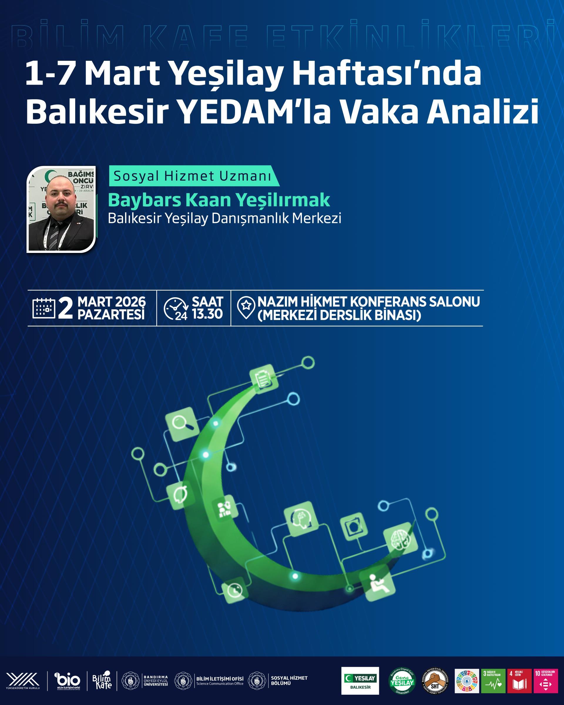 Üniversitemiz Bilim İletişimi Ofisi, Sosyal Hizmet Bölümü, Genç Yeşilay Topluluğu, Sosyal Hizmet Topluluğu ve Balıkesir YEDAM iş birliği ile 1-7 Mart Yeşilay Haftası kapsamında “Balıkesir YEDAM’la Vaka Analizi” konulu etkinlik düzenlenecektir.