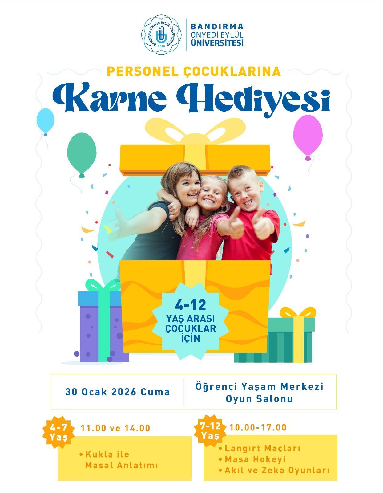 Üniversitemiz personeli çocuklarına yönelik Karne Hediyesi Etkinliği düzenlenecektir. Etkinlik kapsamında, çocuklarımızın yarıyıl tatiline keyifli bir katkı sunmak amacıyla Öğrenci Yaşam Merkezi Oyun Salonu 30 Ocak 2026 Cuma günü ücretsiz olarak hizmete sunulacaktır.