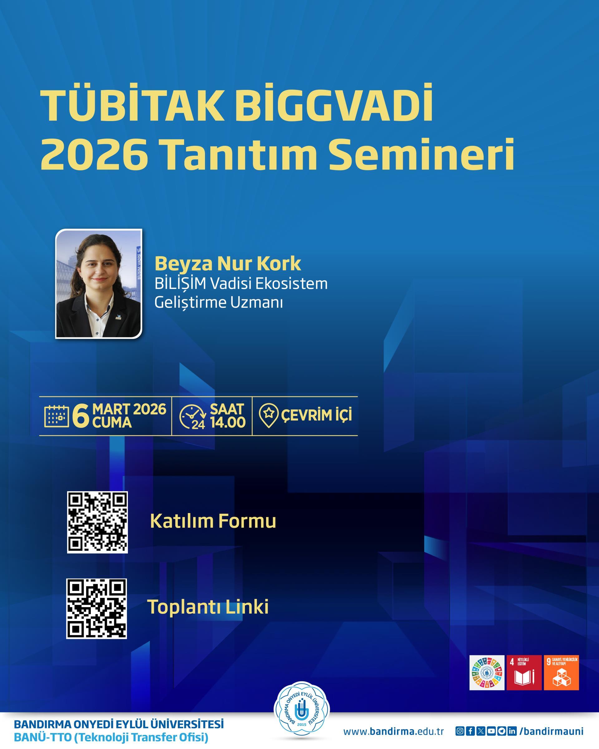 Seminere, Bilişim Vadisi Ekosistem Geliştirme Uzmanı Beyza Nur Kork konuşmacı olarak katılım sağlayacaktır. Etkinlikte TÜBİTAK BİGGVADİ programı, girişimcilik fırsatları ve program başvuru süreçlerine ilişkin bilgiler paylaşılacaktır.