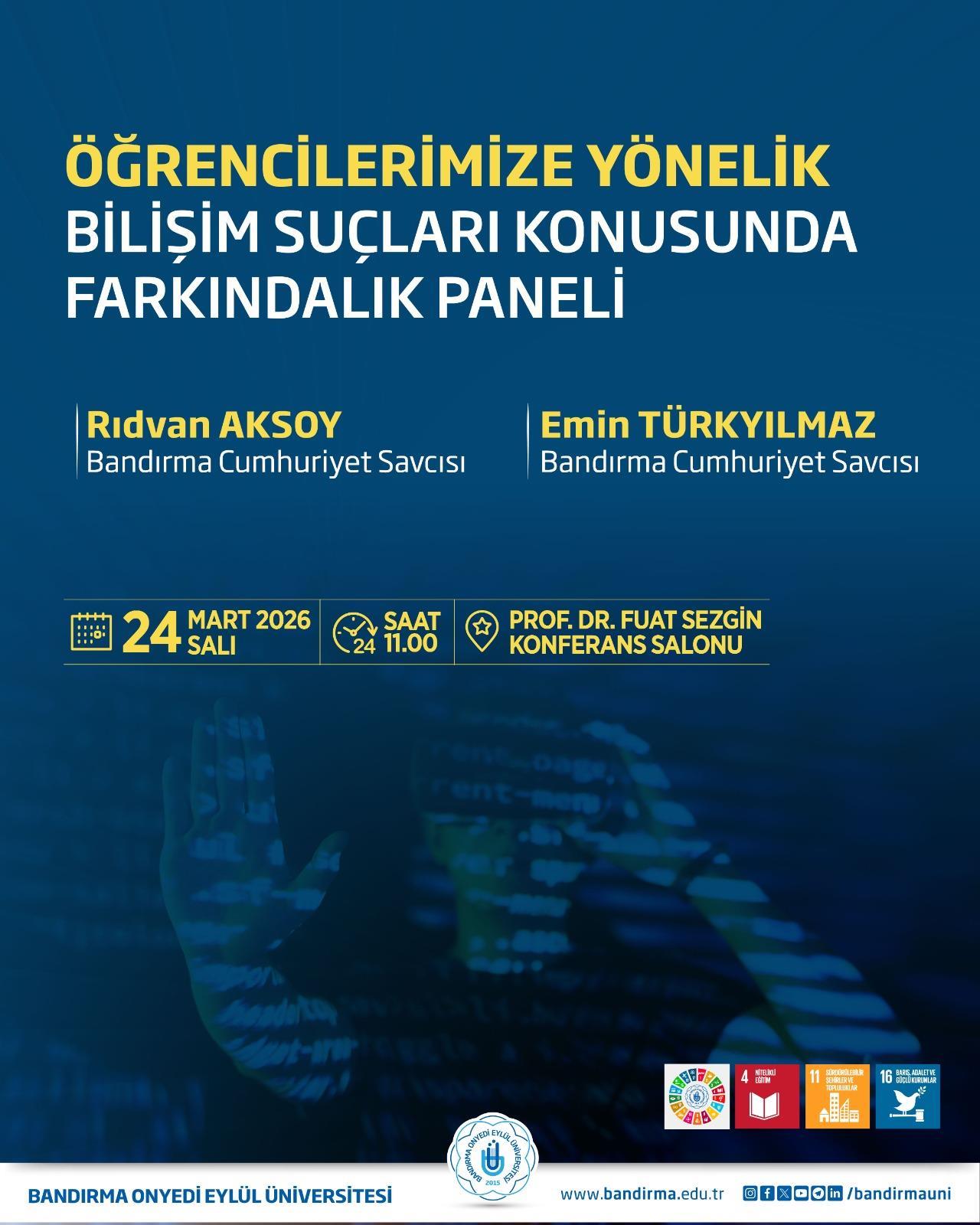 Prof. Dr. Fuat Sezgin Konferans Salonu’nda düzenlenecek olan panele; Üniversitemiz Mühendislik ve Doğa Bilimleri Fakültesi Yazılım Mühendisliği Bölümü Dr. Öğr. Üyesi Fahrettin Burak Demir moderatör olarak, Bandırma Cumhuriyet Savcıları Rıdvan Aksoy ve Emin Türkyılmaz ise konuşmacı olarak katkı sağlayacaktır.