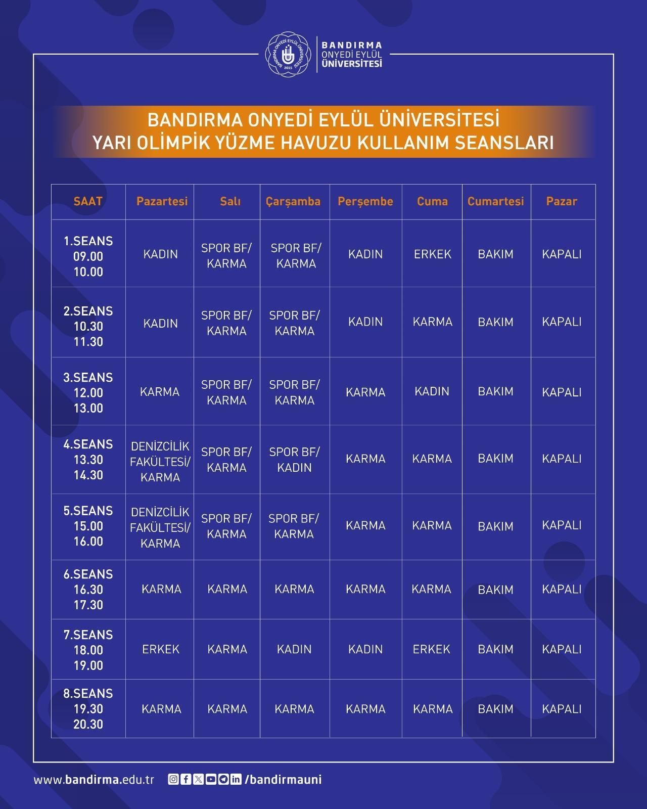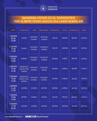 Yapılan yeni düzenleme kapsamında havuz, hafta içi her gün sabah 09.00 ile akşam 20.30 saatleri arasında farklı kullanıcı gruplarına yönelik toplam 8 seans ile hizmet vermektedir. Seanslar; kadın, erkek, karma, Denizcilik ve Spor Bilimleri Fakültesi gruplarına göre planlanmıştır.