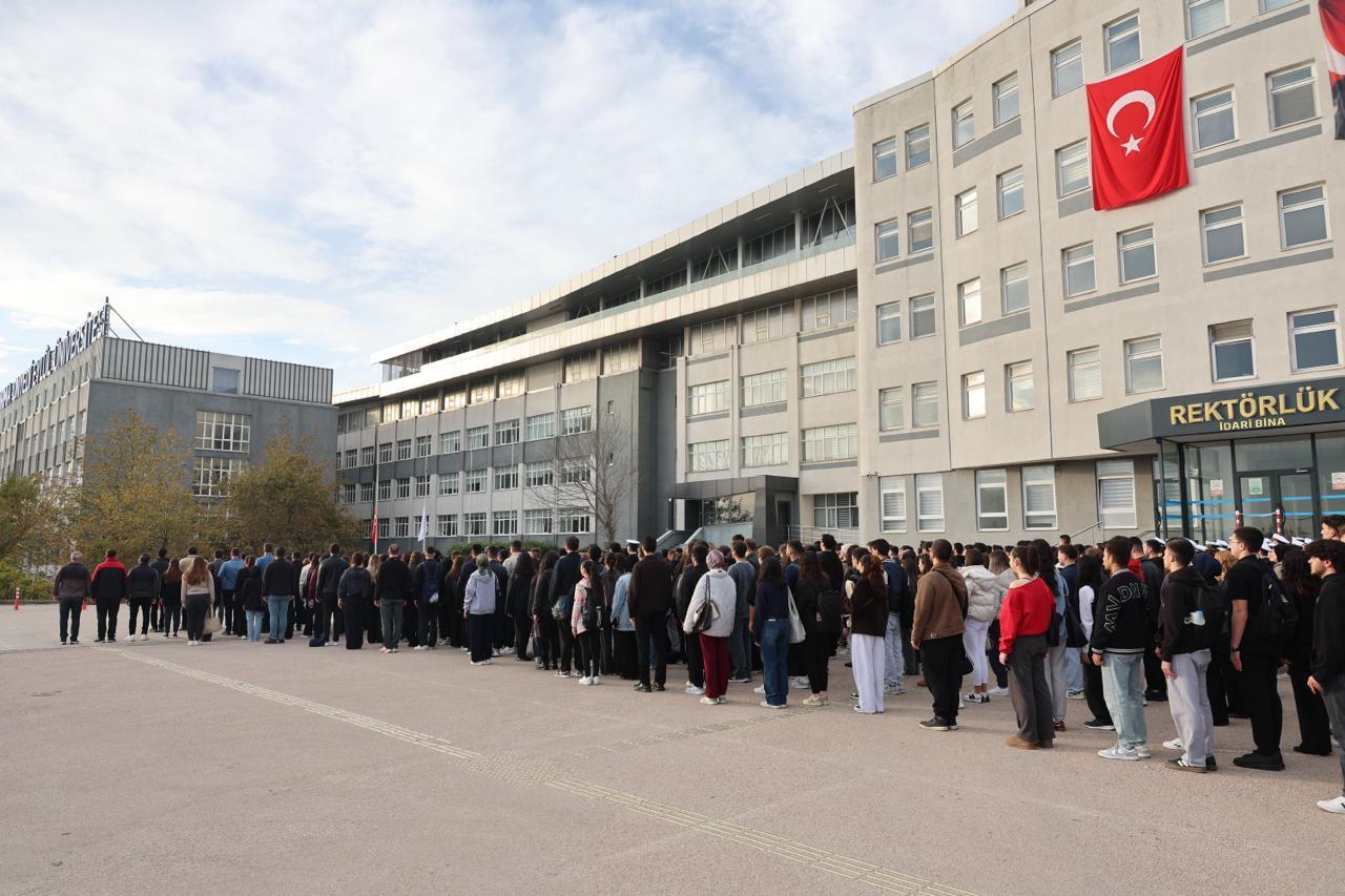 Rektörlük İdari Binası önünde gerçekleştirilen törene; Rektör Yardımcılarımız Prof. Dr. Alpaslan Serel, Prof. Dr. Ebru Kaya Mutlu, Prof. Dr. Mehmet Emin Erçakar, Genel Sekreterimiz Faruk Küçük, akademik ve idari personelimiz ile öğrencilerimiz katıldı.