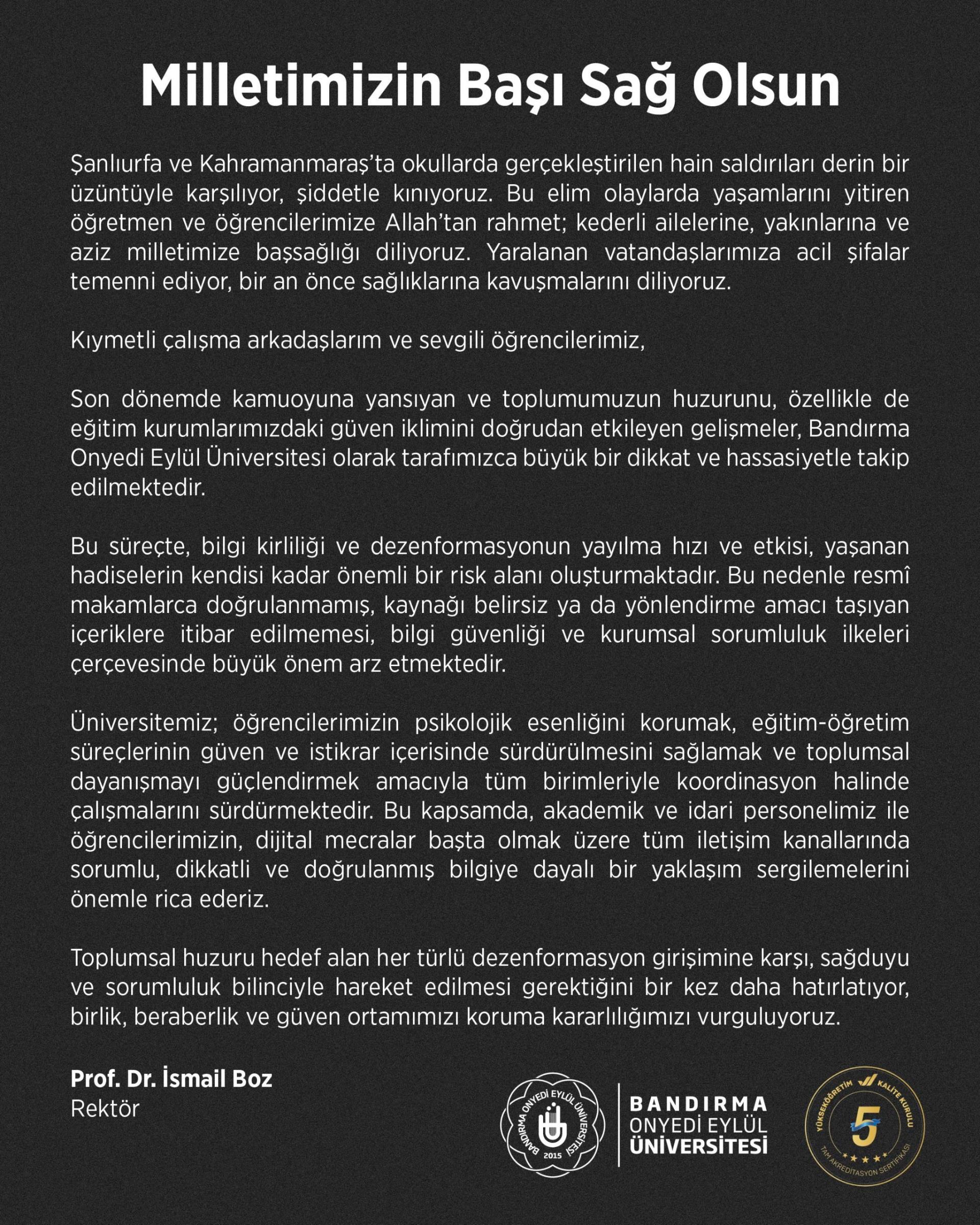 Son dönemde kamuoyuna yansıyan ve toplumumuzun huzurunu, özellikle de eğitim kurumlarımızdaki güven iklimini doğrudan etkileyen gelişmeler, Bandırma Onyedi Eylül Üniversitesi olarak tarafımızca büyük bir dikkat ve hassasiyetle takip edilmektedir.Bu süreçte, bilgi kirliliği ve dezenformasyonun yayılma hızı ve etkisi, yaşanan hadiselerin kendisi kadar önemli bir risk alanı oluşturmaktadır. Bu nedenle resmî makamlarca doğrulanmamış, kaynağı belirsiz ya da yönlendirme amacı taşıyan içeriklere itibar edilmemesi, bilgi güvenliği ve kurumsal sorumluluk ilkeleri çerçevesinde büyük önem arz etmektedir.
