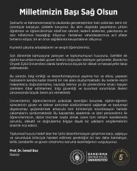 Üniversitemiz; öğrencilerimizin psikolojik esenliğini korumak, eğitim-öğretim süreçlerinin güven ve istikrar içerisinde sürdürülmesini sağlamak ve toplumsal dayanışmayı güçlendirmek amacıyla tüm birimleriyle koordinasyon halinde çalışmalarını sürdürmektedir. Bu kapsamda, akademik ve idari personelimiz ile öğrencilerimizin, dijital mecralar başta olmak üzere tüm iletişim kanallarında sorumlu, dikkatli ve doğrulanmış bilgiye dayalı bir yaklaşım sergilemelerini önemle rica ederiz.