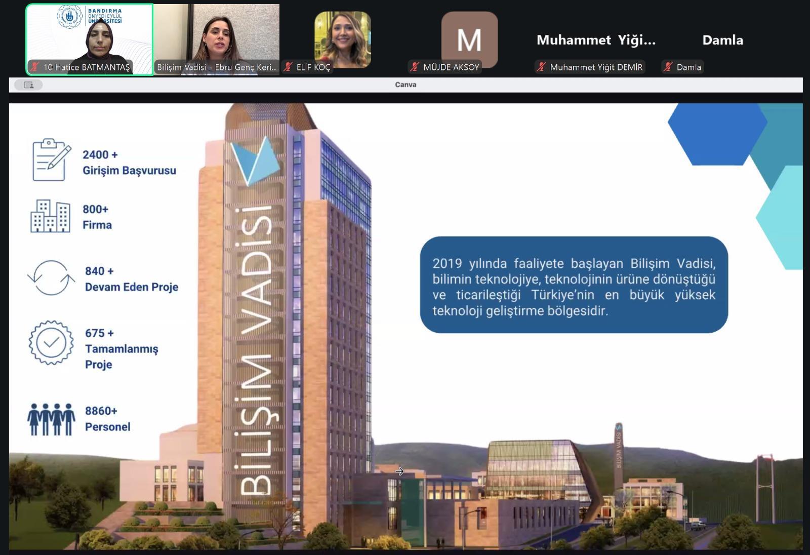 Bilişim Vadisi Ekosistem Geliştirme Kıdemli Uzmanı Ebru Genç Kerim’in konuşmacı olarak katıldığı seminerde TÜBİTAK BİGG Programı ve 2026-1 çağrı süreci hakkında güncel bilgiler paylaşıldı; BİGGVADİ’nin girişimcilere sunduğu kurumsal iş birlikleri, PoC (Proof of Concept) imkânları, yatırım değerlendirme süreçleri, ofis ve altyapı destekleri gibi avantajlar detaylı şekilde aktarıldı.